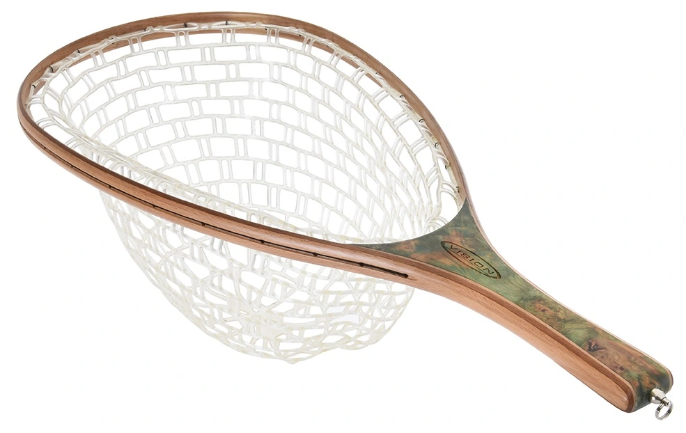 The shallow & transparent silicone net of the Vision Green Wooden Landing Net With Clear Silicone Net almost disappears when kept in water, so the fish shows well out in pictures.